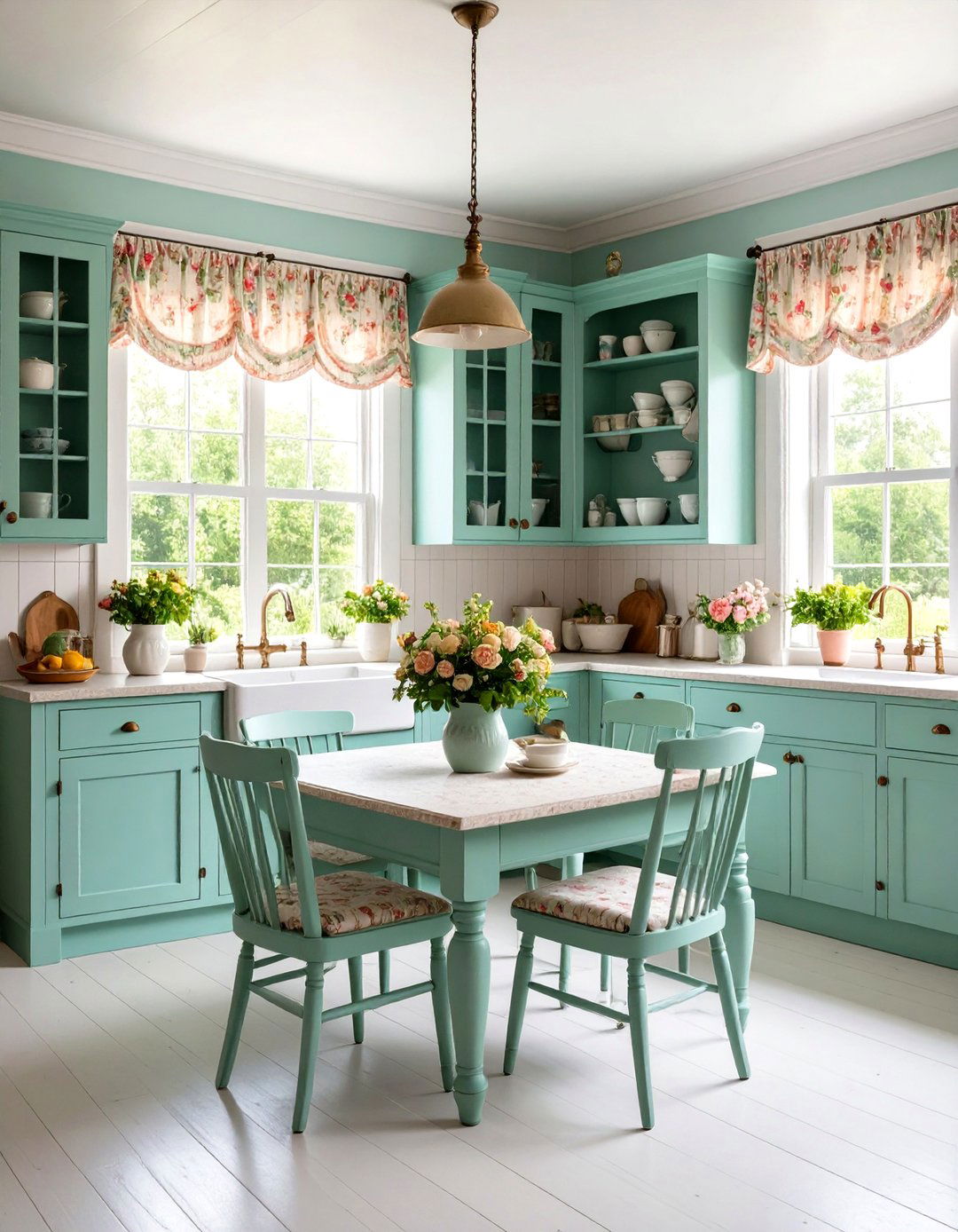 How do you create a kitchen that feels like it's been loved for decades? This charming style celebrates collected treasures, mixed patterns, and comfortable imperfection that develops over time. Painted cabinets in soft pastels like mint green, butter yellow, or powder blue create cheerful backdrops for vintage collections. Open shelving displays mismatched china, vintage glassware, and antique kitchen tools that tell stories of generations past. Beadboard wainscoting adds cottage authenticity, while vintage-inspired appliances in retro colors become focal points. Small floral wallpapers, gingham curtains, and embroidered linens layer pattern and texture throughout the space. A vintage kitchen table serves multiple functions, from prep work to homework station, making this style perfect for families who appreciate both history and functionality.