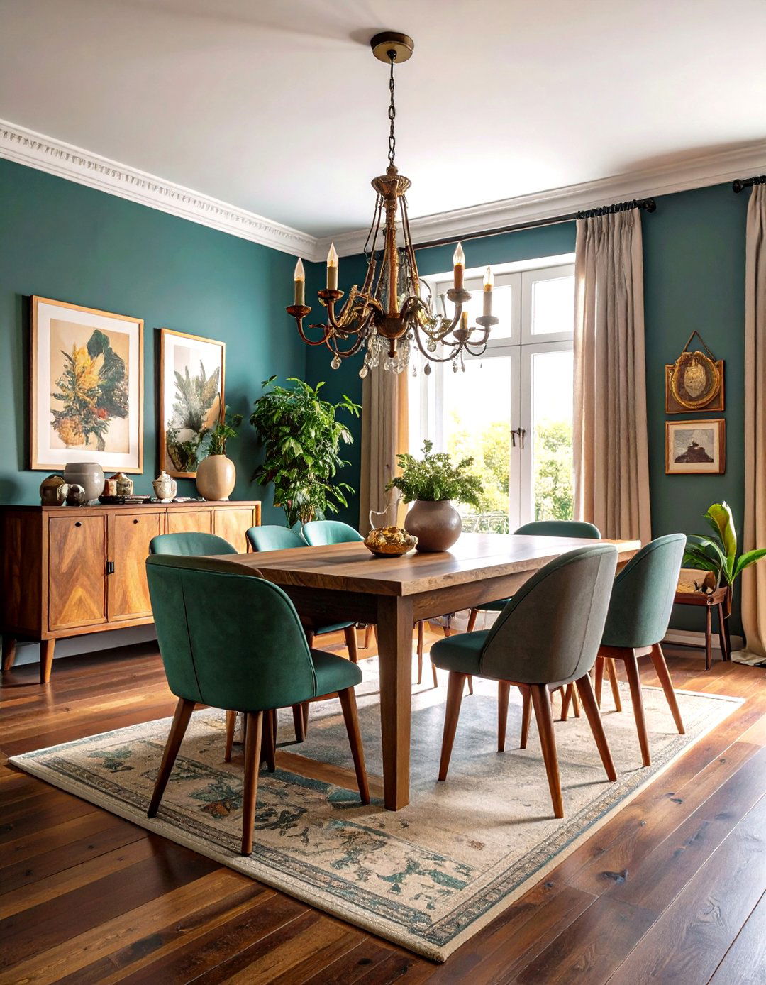 Make a striking statement where vibrant wall colors create dramatic contrast against sophisticated dark wood flooring. Choose rich, saturated colors like deep emerald green, navy blue, or burgundy that complement rather than compete with dark floors. Select dining furniture in lighter woods or painted finishes that bridge the bold walls and dark flooring. Add metallic accents through light fixtures, picture frames, or decorative accessories that reflect light and add glamour. Choose upholstery and textiles that incorporate both the wall color and complementary tones for cohesive design. Include artwork and accessories that celebrate the bold color choice while maintaining sophisticated balance. This approach creates a confident, personality-filled environment perfect for those who embrace color and want their dining room to make a memorable impression.