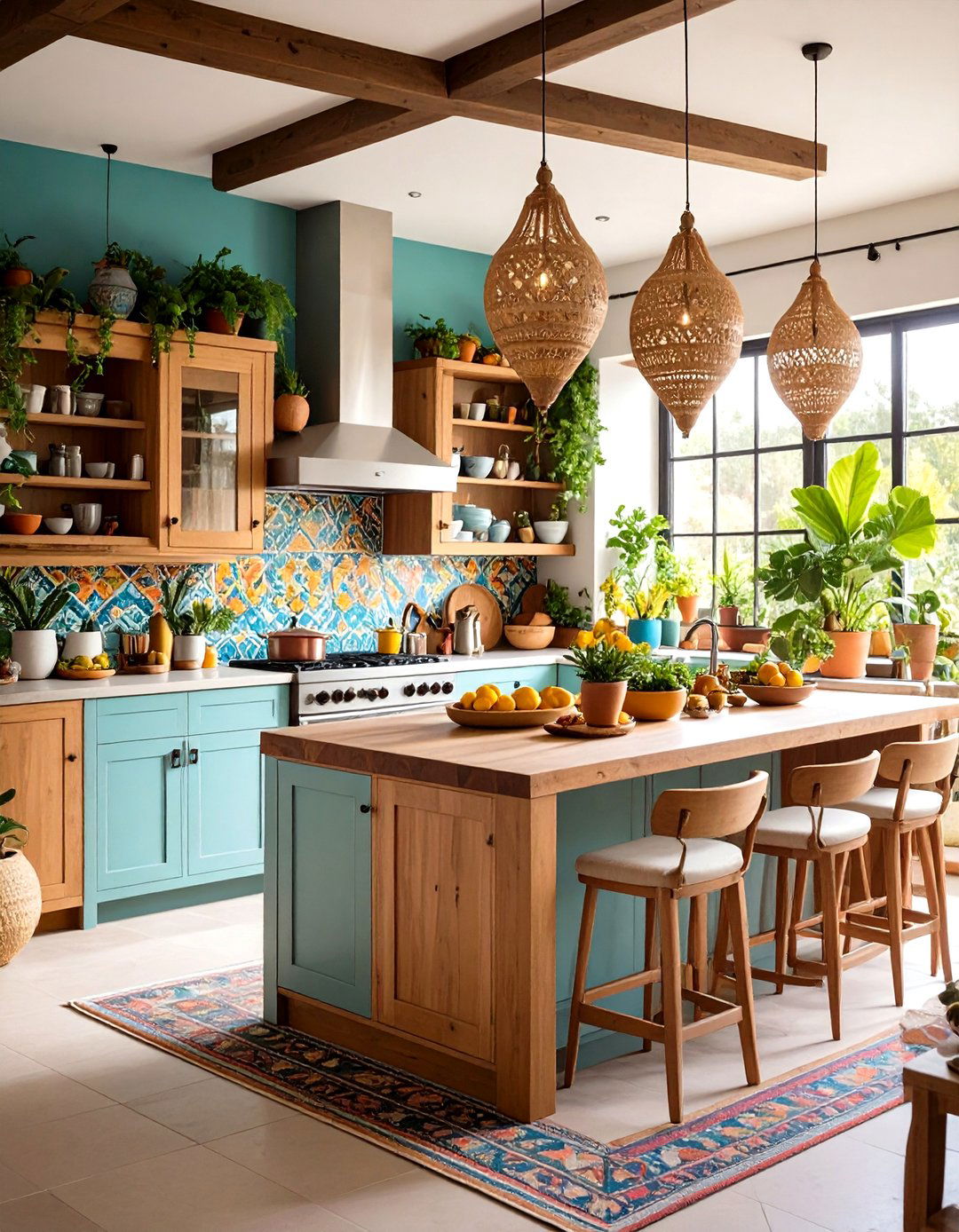 Bohemian style creates vibrant open kitchens through eclectic patterns, rich colors, and global tile backsplashes featuring Moroccan or Turkish patterns serve as artistic focal points while natural wood cabinetry provides warm metals in brass, copper, and bronze add warmth and authentic patina throughout the kitchen island features live-edge wood tops and colorful base cabinets that celebrate lights with beaded or fabric shades create intimate lighting while plants and textiles add natural shelving displays collections of ceramics, spices, and cookbooks that reflect the homeowner's travels and interests, flowing into living spaces filled with layered textiles and global artifacts.