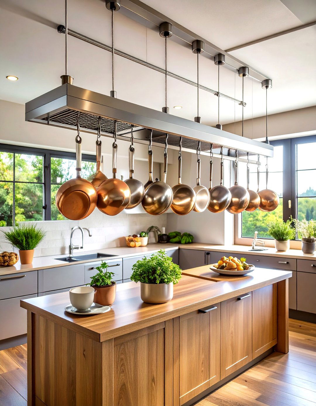 Window-mounted pot storage creates unique focal points while maximizing natural light areas that often remain underutilized in kitchen design. This approach works best with attractive cookware that complements the kitchen's aesthetic, as the items become part of the room's visual display. Strong mounting systems ensure safe installation that won't compromise window operation or structural integrity. The natural light location makes it easy to inspect cookware condition while the open air circulation helps prevent moisture issues. When implemented thoughtfully, window storage can enhance kitchen views rather than obstruct them, particularly when using uniform cookware sets with attractive finishes. Consider the impact on privacy and light filtration when planning window-mounted storage solutions.