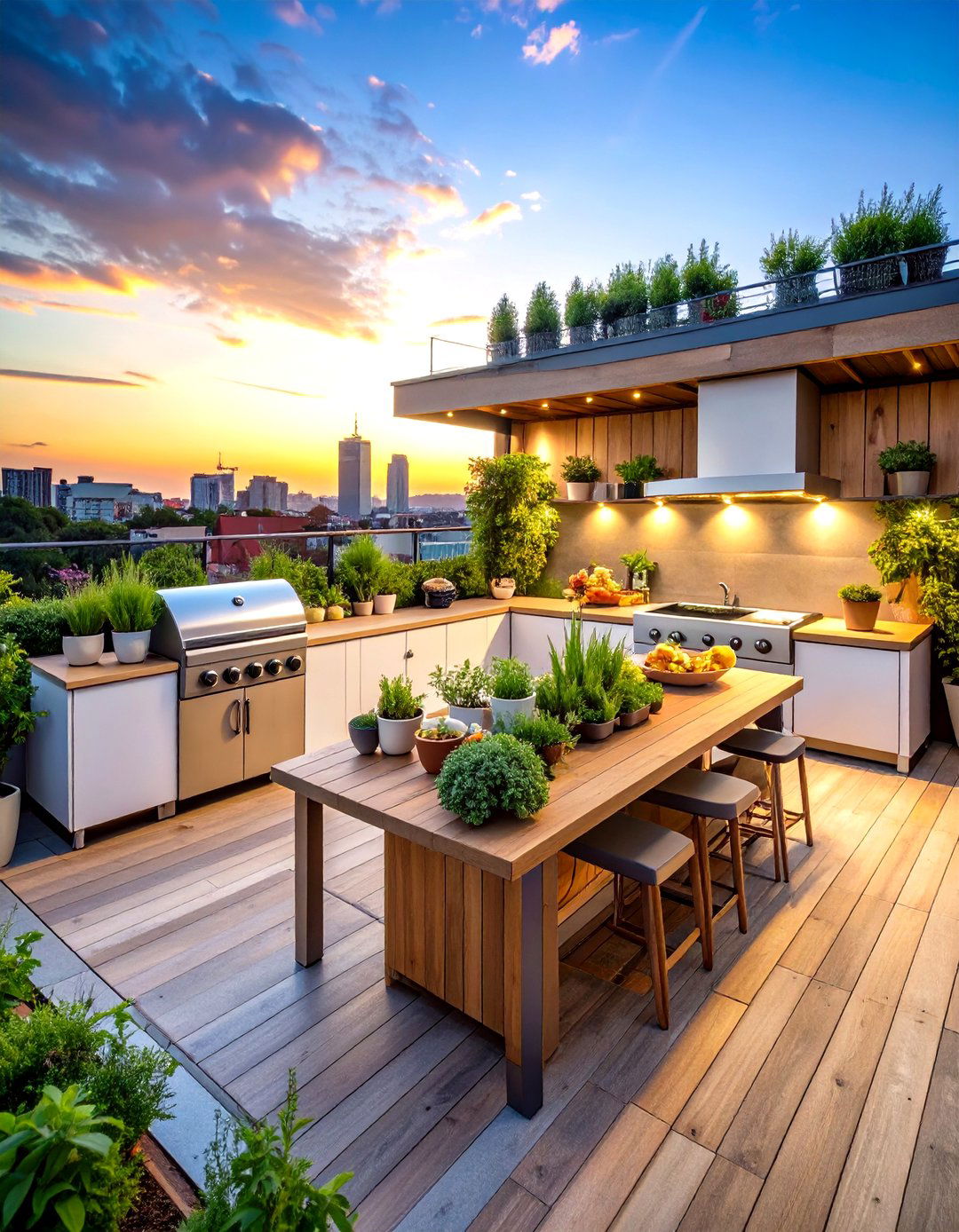 Design functional outdoor cooking areas that complement rooftop gardens while providing convenient food preparation spaces for fresh harvests. Weather-resistant appliances include portable grills, prep counters, and storage solutions that withstand outdoor conditions while providing professional cooking capabilities. Herb gardens positioned near cooking areas ensure fresh seasonings are always within reach during meal preparation activities. Storage solutions protect cooking equipment while maintaining organized appearance between entertaining events and daily use. How will your outdoor kitchen enhance rooftop garden-to-table experiences? Proper electrical and plumbing connections support appliances while ensuring safety codes compliance for permanent installation options. Shade structures protect cooking areas from intense sun while providing comfortable working conditions during peak hours. These integrated systems transform rooftop spaces into complete outdoor living environments where growing and cooking happen seamlessly within the same space.