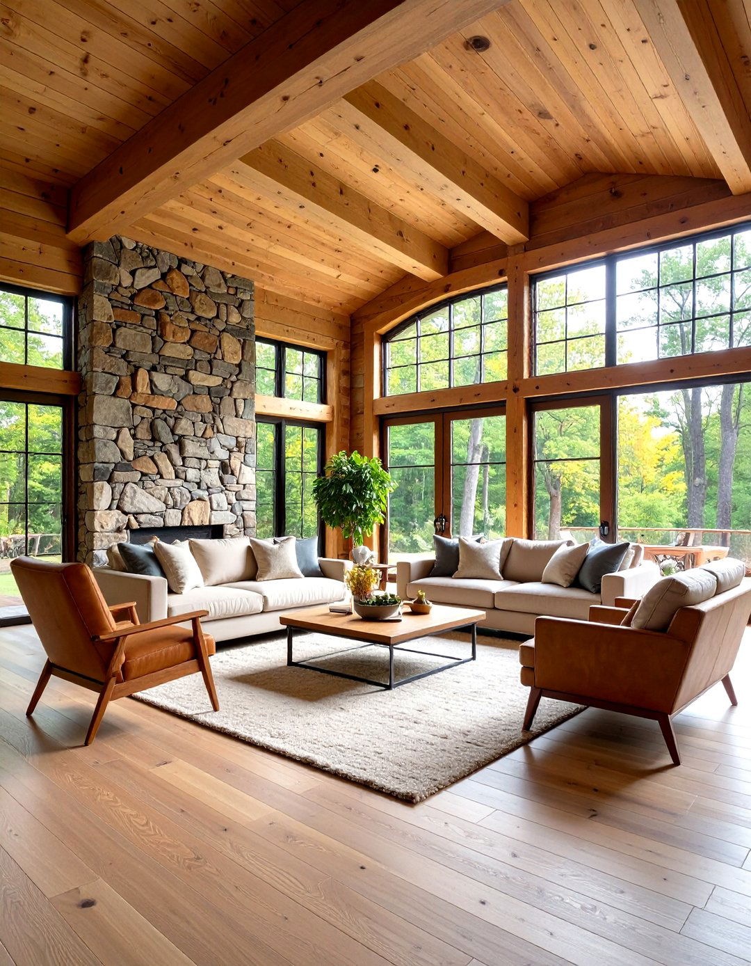 Feature natural stacked stone in varying earth tones that creates dramatic texture against a warm wood plank vaulted ceiling. The stone's irregular surfaces and natural color variations provide visual interest while the wood ceiling adds warmth and character overhead. Rustic furniture pieces in weathered finishes complement the natural materials while maintaining comfort for daily use. Strategic lighting highlights both the stone's texture and the wood ceiling's grain patterns. Large windows frame outdoor views while natural light enhances the materials' authentic beauty. This design approach brings together two classic natural materials to create a space that feels both rugged and refined.