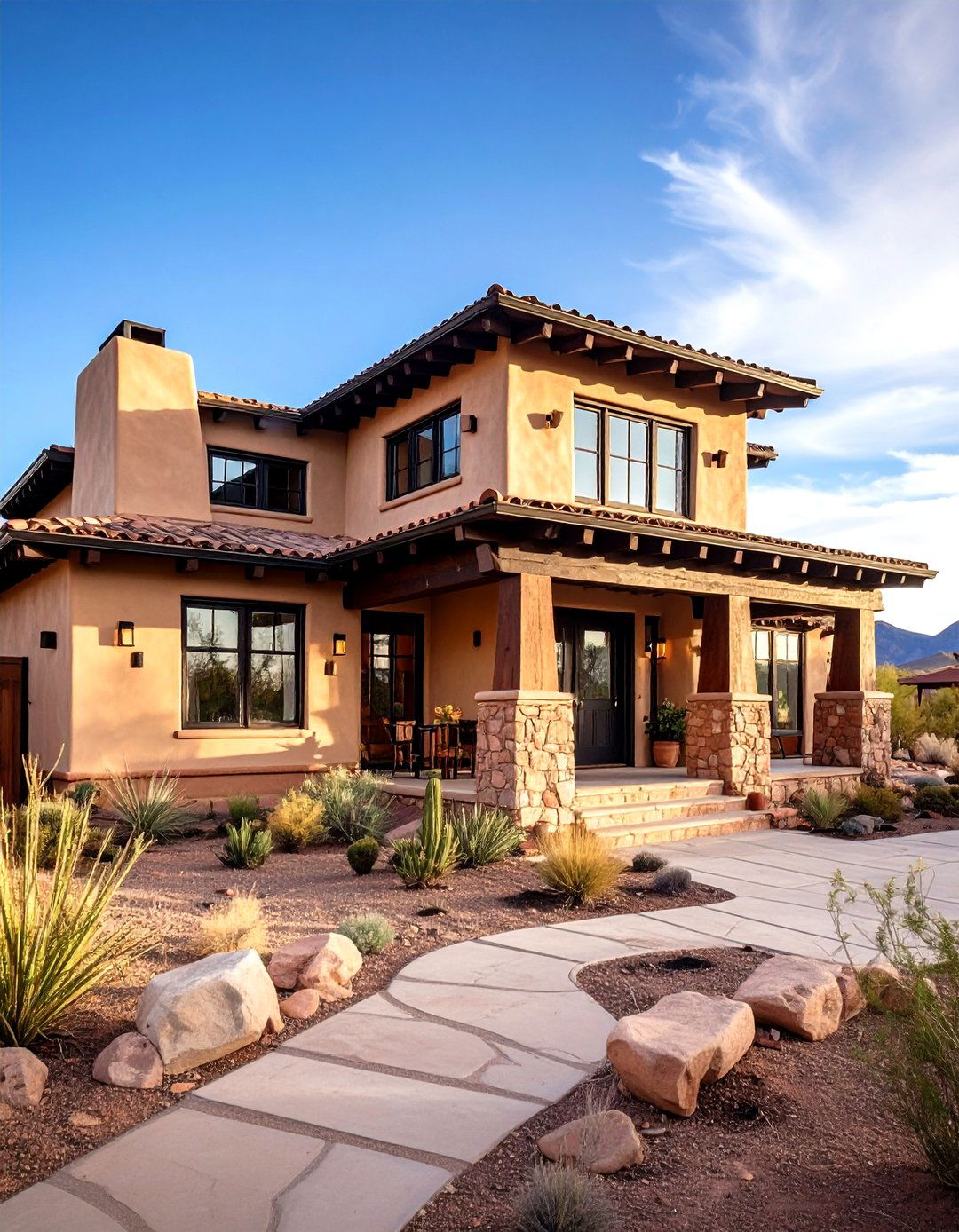 What makes Southwestern architecture feel both authentic and contemporary? Tan stucco walls reminiscent of traditional adobe paired with black trim details create desert elegance that honors regional traditions while feeling current and sophisticated. The smooth texture of tan stucco provides desert-appropriate durability while black window trim and door details create crisp contrast against the neutral backdrop. Flat rooflines with black parapet walls maintain the style's connection to Pueblo architecture while creating opportunities for rooftop outdoor spaces and dramatic sky views. This design approach works particularly well with xeriscaping, outdoor courtyards, and landscape elements that celebrate the beauty of desert environments.